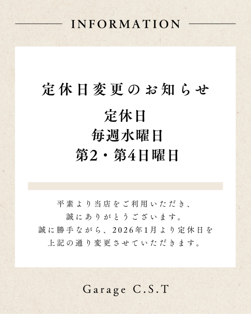 誠に勝手ながら、2026年1月より定休日を下記の通り変更させていただきます。